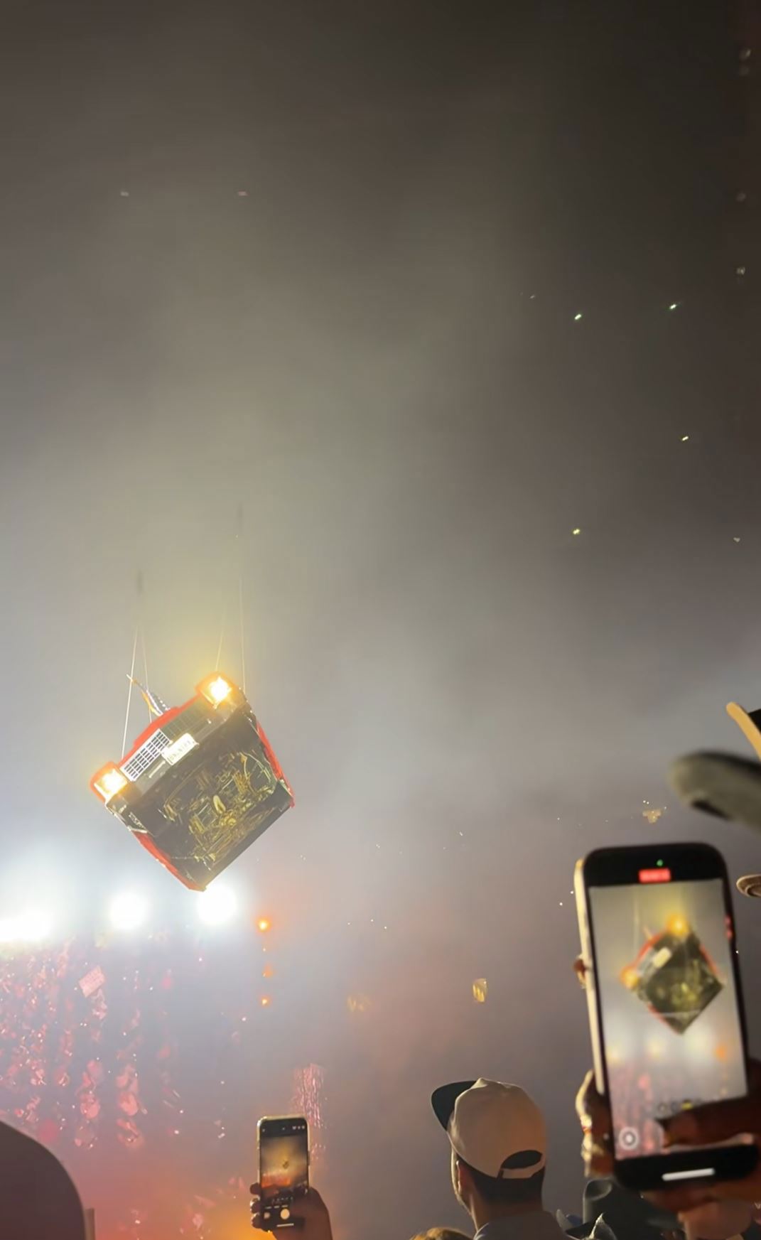 Then the prop car, hanging over the crowd, began to tilt mid-air and came to a halt, leaving her fans scared for her safety.