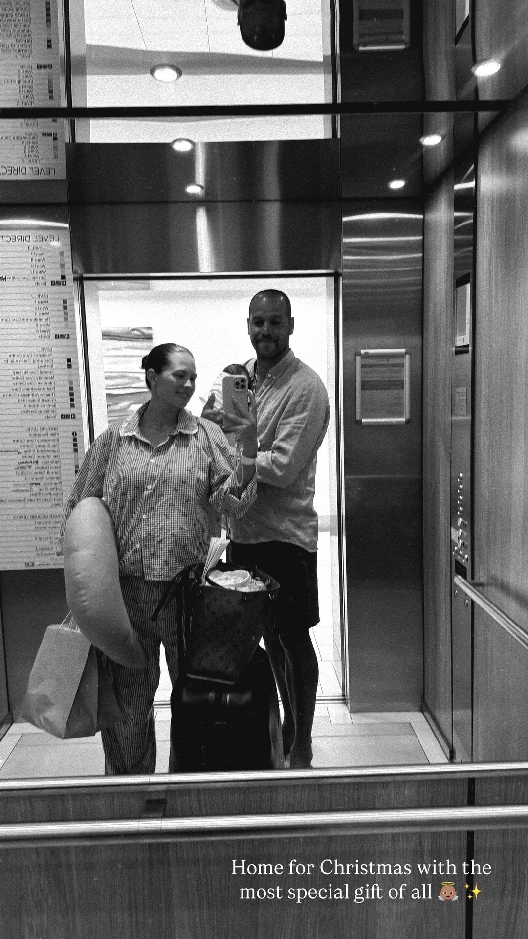 In her Stories, she shared a photo of the couple in an elevator, their newborn nestled in Dad's arms.